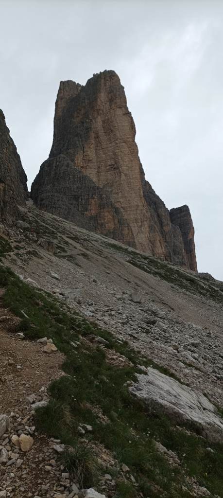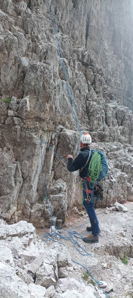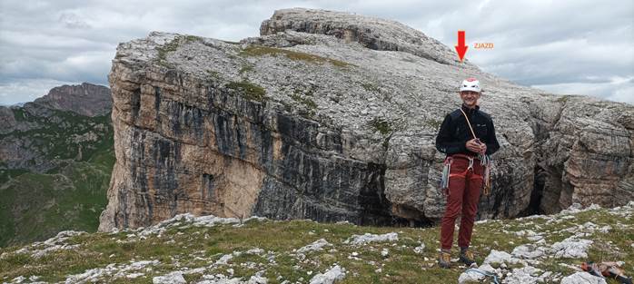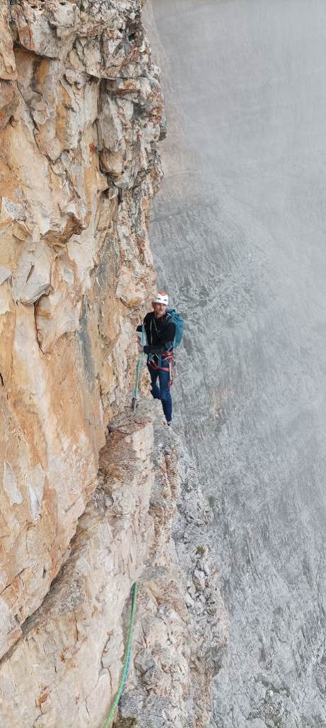 Zejście jest dobrze opisane w powyższym przewodniku. Generalnie należy podążać półką następnie zacięciem do góry i kolejną półką na końcu której jest zjazd na przełączkę. Dojść do głównego szczytu Cima Piccola gdzie jest pierwsze z ośmiu stanowisk zjazdowych. Wszystkie stanowiska są nowe z olbrzymich ringów. Należy omijać nadal wiszące stare stanowiska zjazdowe. Zjeżdża się na przełęcz między Cima Piccola a Cima Grande. Stamtąd schodzi się żlebem w prawo stojąc przodem do ściany po której się zjeżdża. W żlebie jest jeszcze jeden krótki zjazd przez zaklinowany głaz. My dalej zastaliśmy sporo starego twardego śniegu. Trochę udało nam się po nim zejść resztę zjechaliśmy na pełną długość 60 metrów z nienajlepszego stanowiska. Ze żlebu wychodzi się na ścieżkę podejściową pod ścianę a później szlakiem do schroniska Auronzo