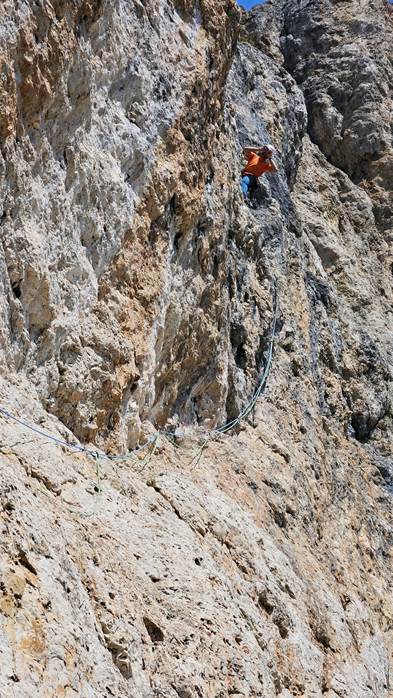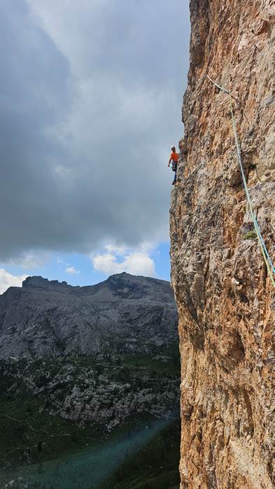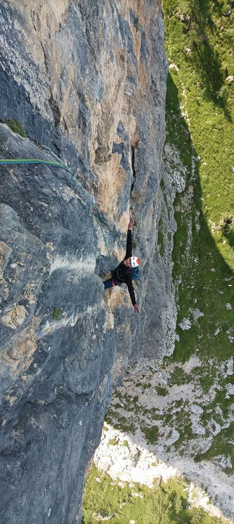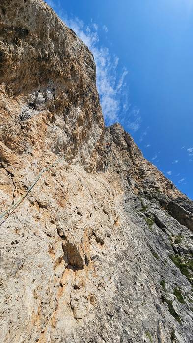 Droga wyposażona w stałą asekurację. Pierwsze wyciągi bez szału. Momentami krucho i dość rzadko obite. Dalej skała lita. Od dość czujnego trawersu zaczyna się doskonałe wspinanie. Kluczowy wyciąg w przewodniku wyceniony jest na 6b. Na stronie autora Mario Dibona wycena jest 6b/A0. Przeszliśmy to klasycznie OS i w moim odczuciu może być około 6c+. Na trudniejszych wyciągach asekuracja bardzo dobra. Droga wygląda na rzadko chodzoną (byliśmy sami, a na sąsiedniej Nikibi trzy zespoły). Przy okazji polecam Nikibi 6b+. Zrobiłem ją wiele lat wcześniej i zapamiętałem jako bardzo fajne wspinanie.