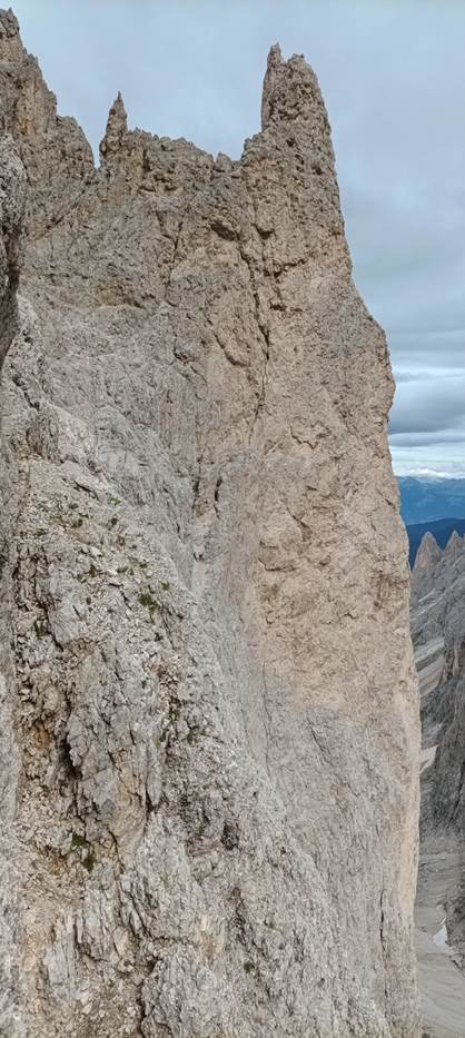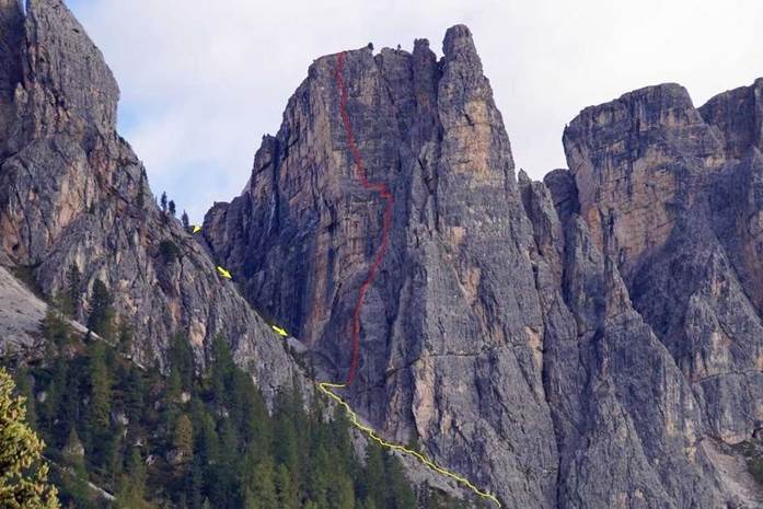 Schemat i opis w przewodniku Mauro Bernardi Dolomity Najpiękniejsze drogi wspinaczkowe i ferraty wokół doliny Val Gardena. Pomimo niewielkich trudności droga moim zdaniem bardzo ładna. Biegnie głównie filarem. Skała lita.